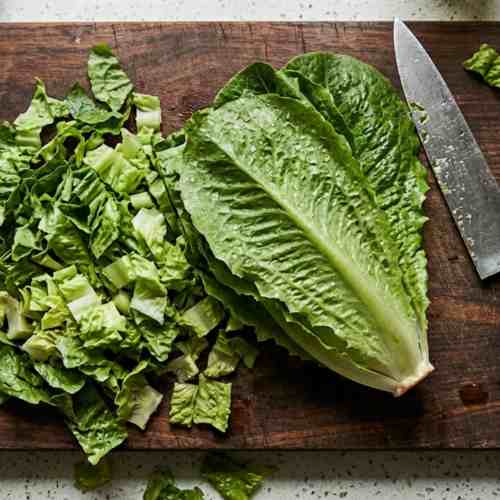 - Wash romaine lettuce under cold water and dry it completely using a towel. Chop into small bite-size pieces and set aside.