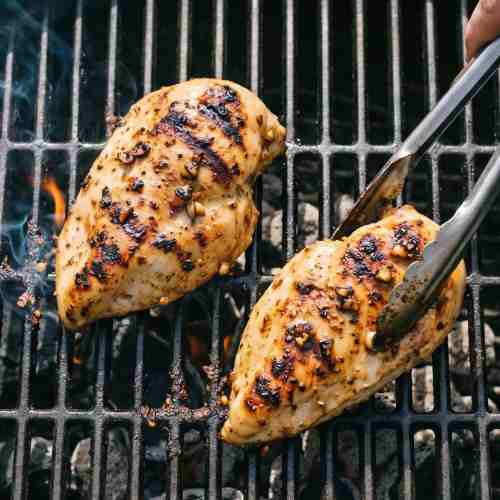 Remove the chicken from the marinade and let any excess drip off. Place the chicken on the grill with some space between each piece. Cook for about 6 to 7 minutes on the first side without moving it too much. Flip the chicken carefully using tongs and cook for another 6 to 7 minutes. The outside should have clear grill marks, and the inside should be fully cooked.