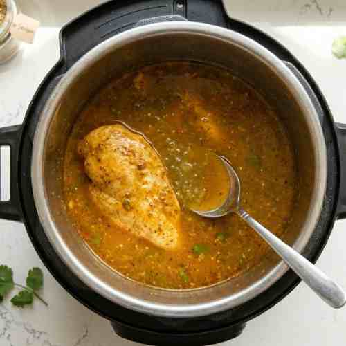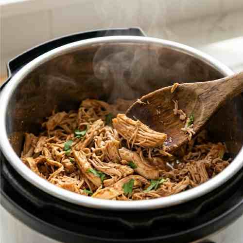 - Open the lid and shred the chicken directly in the pot using two forks. Stir the chicken into the cooking liquid so it stays juicy.