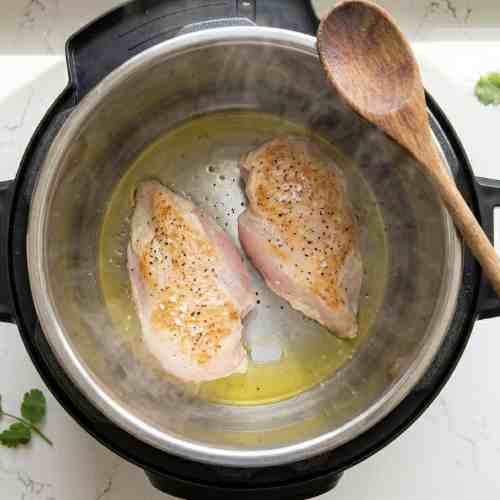 - Turn the Instant Pot to saute. Add olive oil. Place chicken breasts in the pot and sprinkle with salt and pepper. Cook for about 2 minutes per side. This adds flavor but can be skipped if needed.