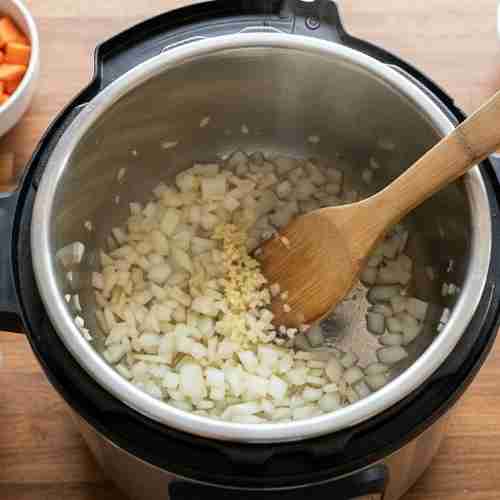 - Turn your Instant Pot to sauté mode. Add a little oil and cook the onions and garlic until soft and fragrant, about 2 to 3 minutes.