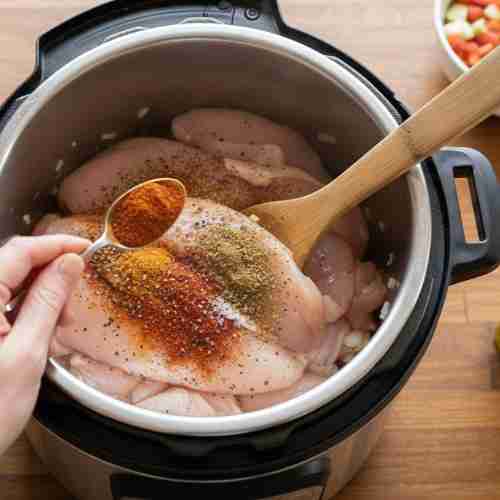 - Place chicken on top of the onions. Sprinkle cumin, chili powder, smoked paprika, salt, and pepper over it. Stir a little so the spices coat the chicken.