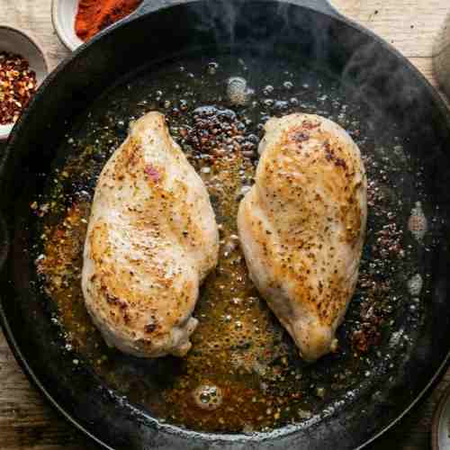 Flip the chicken and cook the other side for another 5 to 7 minutes. The chicken should be fully cooked and no longer pink inside. Remove the chicken from the pan and set it aside on a plate.