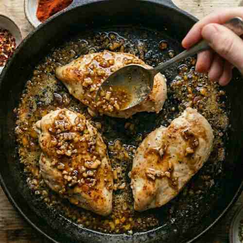 - Return the chicken to the pan. Spoon the sauce over the chicken and let it simmer for 2 to 3 minutes.