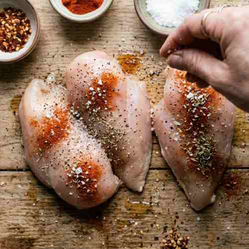 - Season both sides of the chicken with salt, black pepper, paprika, and oregano. Gently press the seasoning into the chicken.
