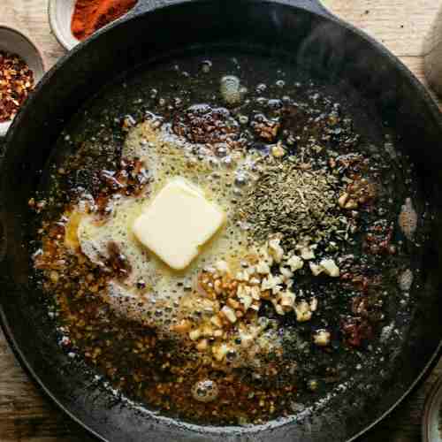 - Reduce heat to medium-low. Add butter to the same pan and let it melt slowly.