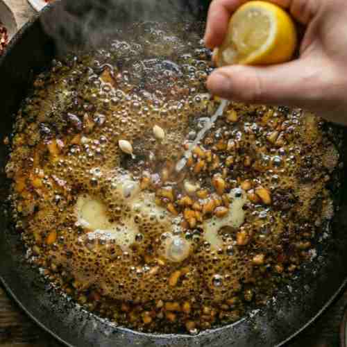 Pour in the fresh lemon juice and add the lemon zest. Stir well to combine with the butter and garlic.