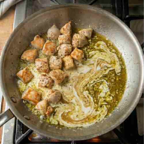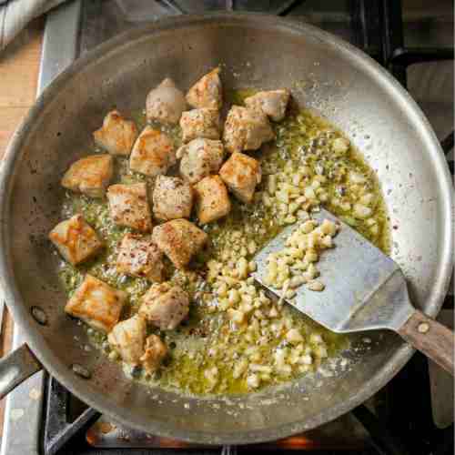 Add the minced garlic directly into the pan with the cooked chicken. Stir gently so the garlic mixes with the oil and chicken juices. Let it cook for about one minute. The garlic should become fragrant but not browned. Stir often to prevent burning.