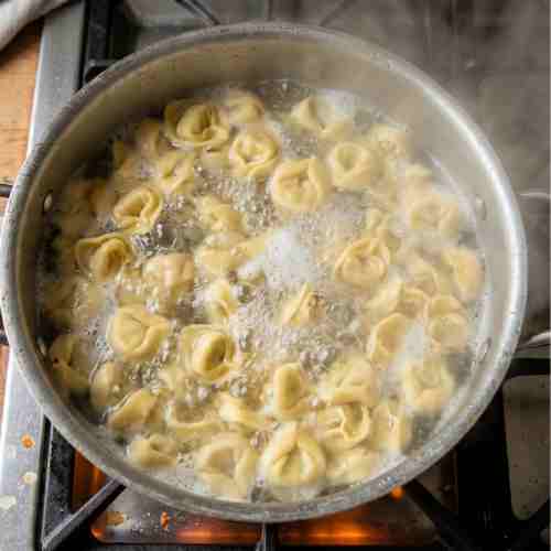 - Bring a large pot of salted water to a boil. Add tortellini and cook until tender according to package instructions. Stir occasionally, then drain and set aside. Reserve a small amount of pasta water.