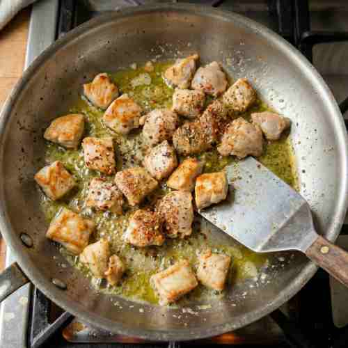 - Heat olive oil in a large skillet over medium heat. Add diced chicken in a single layer. Season with salt, pepper, and Italian seasoning. Cook without stirring for a few minutes, then flip and continue cooking until chicken is fully cooked and lightly golden.