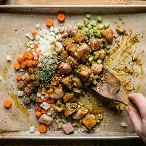 Using clean hands or a large spoon, gently toss the chicken and vegetables together directly on the pan. Make sure the oil and seasonings coat all pieces evenly. Take your time with this step because it helps the flavors spread properly.