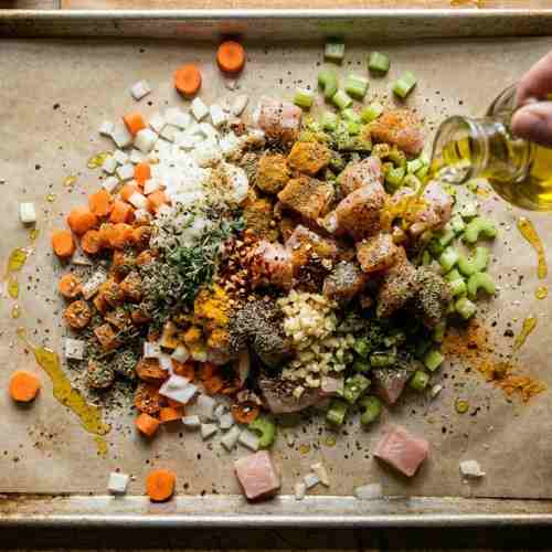 - Drizzle olive oil evenly over the chicken and vegetables, making sure most pieces are lightly coated.
