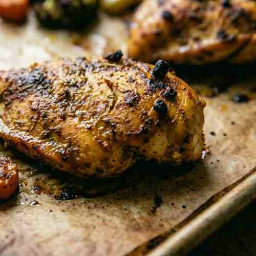 - Continue baking until the chicken is fully cooked and the vegetables are tender with slightly browned edges.