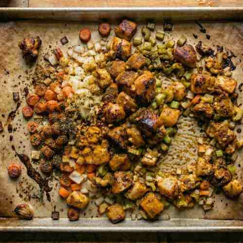 - Spread the mixture into a single layer across the sheet pan, making sure pieces are not overcrowded.
