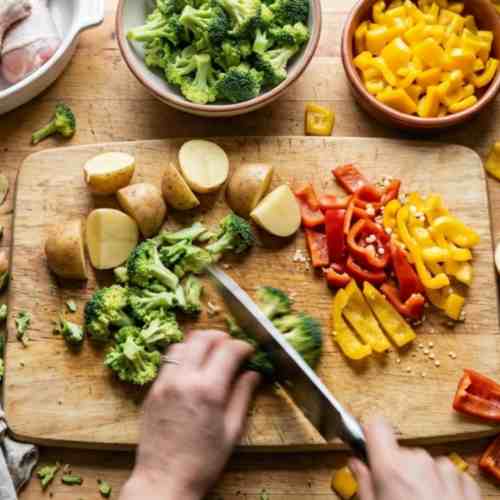 - Wash and dry all vegetables. Cut broccoli into small florets, slice bell peppers into strips, and cut potatoes into even pieces for uniform cooking.