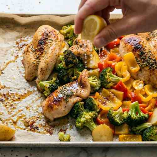 Remove the pan from the oven and let it rest for a few minutes. Drizzle fresh lemon juice over the chicken and vegetables. This adds a bright and fresh flavor that balances the roasted taste.