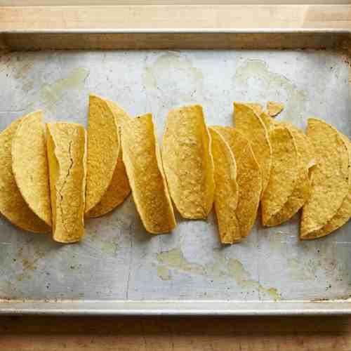 - Preheat oven to 375°F. Line a sheet pan with parchment paper or foil if desired. Arrange taco shells upright on the pan so they stay open.