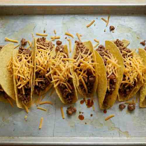 - Sprinkle shredded cheese over each taco, making sure to cover the filling.