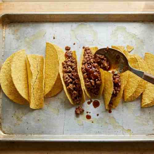 Do not overfill the shells. Leave a little space at the top so the tacos hold their shape and are easier to eat. If using beans and corn, add a small spoonful into each taco along with the meat.